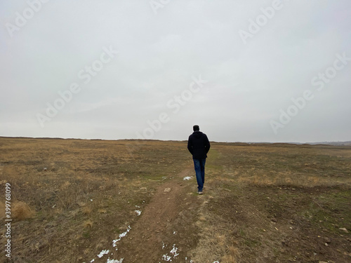 landscape, mountain, walking, nature, sky, hiking, woman, people, hill, grass, travel, outdoors, mountain, walk, path, autumn, hike, road, holiday maker, view, adventure, blue, person, green