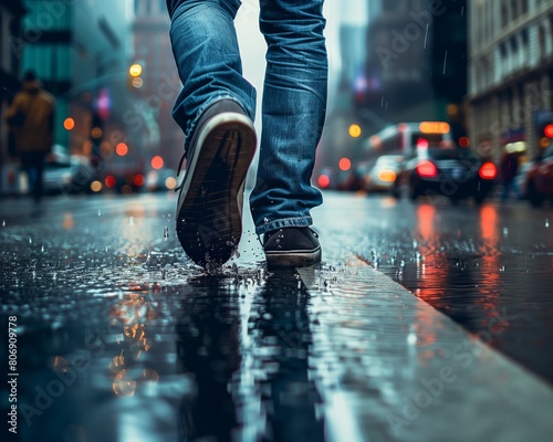 rain, city, street, walking, urban, shoe, puddle, wet, lifestyle, pedestrian, water, bokeh, weather, sidewalk, leg, journey, traffic, person, splash, city landscape, walk, casual attire, jean, asphalt, travel, mood, tied-up, light, moody, rainy season, footwear, drop, commute, downtown, overcast, stroll, alone, comfort, city life, pavement, destination, movement, raindrop, blurred background, daytime, weatherproof, foot