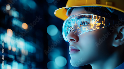 men at work, construction, engineering, technology, futuristic, goggles, helmet, safety, blue, yellow, digital, innovation, industry, building, urban, vision, sharpened, professional, smart, design, modern, future, looking up, profile, face, closeup, detail, light, bokeh, concept, development, progress, planning, visual, artificial intelligence, datum, network, system, communication, security, monitoring, analysis