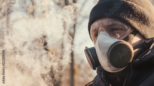 mask, protection, fog, smoke, safety, environment, outdoors, health, breathing, individual, portrait, winter, technology, industry, pollution, chemical, men at work, inspection, gear, humanity, equipment, nature, hazardous, lifestyle, isolation, awareness, struggle, sharpened, face, foggy, mist, risk, danger, survival, resilience, urgency, preparation, caution, eye, filter, coverage, personal, hygiene