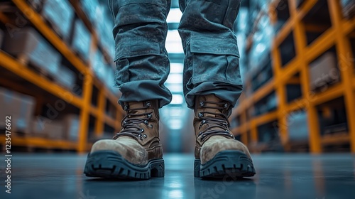 Person wearing tactical pants and boots standing in a warehouse setting