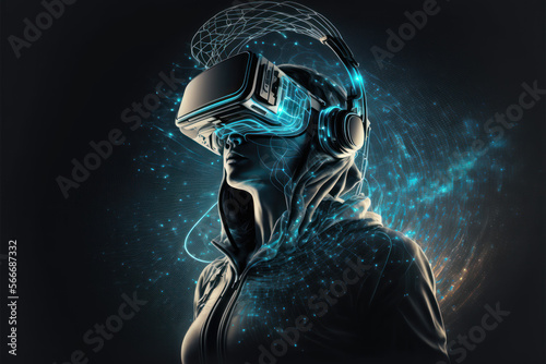 Person wearing virtual / augmented reality headset, immersion into metaverse - AI Generated