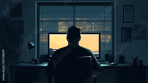 person, working, night, city, view, home, office, digital, art, illustration, productivity, relaxation, evening, computer, silhouette, focused, calm, creative, desk, window, urban, light, interior, modern, design, still, life, peaceful, sharpened, late, work, graphic, visual, image, concept, contemporary, dark, room, study, workspace, scene