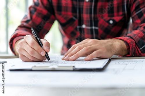 blueprint, architect, clipboard, writing, planning, design, engineer, construction, drawing, paper, project, drafting, architecture, work, pen, plan, tool, document, office, workspace, table, desk, hand, contractor, male, business, closeup