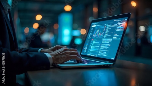 laptop, datum, chart, financial, business, technology, graph, screen, man, analysis, computer, office, work, online, cyberspace, digital, coding, information, software, application, device, keyboard, table, hand, finger, typing, suit, dark, bokeh, light, city, urban, night, person, indoor, display, network, connection, interface, professional