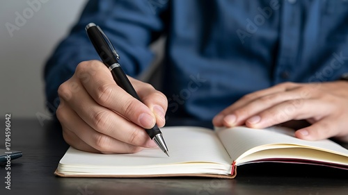 writing, hand, pen, notebook, open, note, taking, note, learning, education, study, work, business, office, desk, paper, blank, page, person, human, finger, detail, closeup, indoor