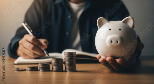 Person writing on notebook with piggy bank and stacks of coins symbolizing financial saving and investment
