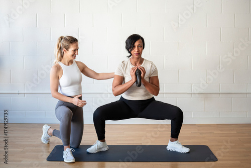 black, california, caucasian, ethiopian, hispanic, russian, frisco, activewear, athletic, balance, coaching, confident, core, determination, discipline, empowerment, encouragement, female, fitness, sharpened, form, gym, health, lifestyle, motivation, personal trainer, posture, powerful, resistance training, squat, strength, strong, perspiring, teamwork, technique, weight training, wellness, woman, physical exercise, us, two people, multiracial, white