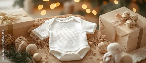 Personalized baby onesie with custom embroidered name nestled in a beautifully designed gift package showcased in a 3D illustrated scene This heartfelt and unique present is perfect for baby showers