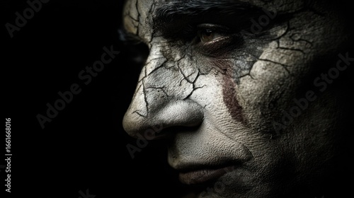 portrait, face, profile, skin, cracked, make-up, dark, shadow, texture, detail, human, person, male, man, art, artistic, dramatic, emotional, intense, expression, eye, looking, side, view, closeup, contrast, light, head, strong, beauty, grotesque, frightening, eerie, skittish, strange, weird, fantasy, concept, conceptual, design, creative, studio, model, shot, style, paint