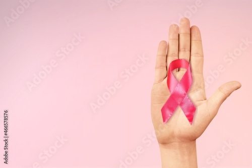 Persons hand holding the pink ribbon in palm symbol of breast cancer awareness