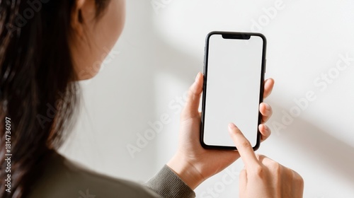 smartphone, mobile phone, blank screen, holding, hand, finger, touching, technology, communication, digital, user, interface, app, connection, screen, modern, device, white background, clean, simple, interaction, person, female, copy space, horizontal