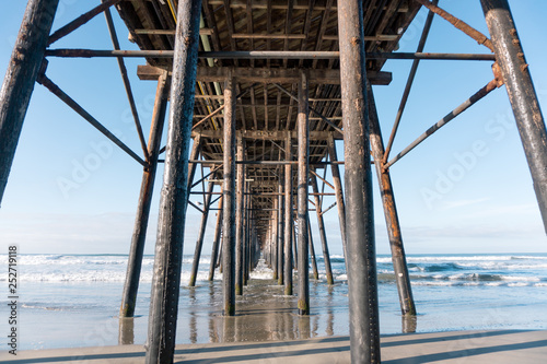 Perspectiva debaixo de um píer de madeira, em praia na California