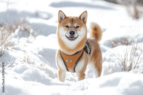 Pet GPS. Shiba Inu Dog with GPS Tracker in Snow on Frosty Winter Day
