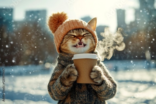 pet, kitten, clothes, cocoa, intelligent, winter, warm, cat, care, veterinary, amusing, comical, felino, joke, commercial, health, hot beverage, creature, frost, sociable, serene, interactive, love, graceful, affection, urban, window display