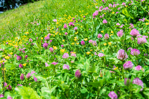 Petite prairie sous le soleil, remplie de fleurs de trèfle roses et de boutons d'or jaunes