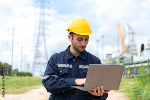 background, building, cable, caucasian, chemical, construction, control, distillation, electricity, employee, energy, engineer, engineering, equipment, facility, factory, fuel, gas, helmet, high voltage, industrial, industry, infrastructure, inspect, inspection, inspector, laptop, maintenance, male, man, manufacturing, oil, people, petrochemical, crude oil, pipe, plant, pointing, pole, portrait, power, powerline, professional, refinery, safety, service, site, technician, technology