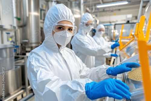 Pharmaceutical Factory Workers, Protective Suits, Inspecting Pills