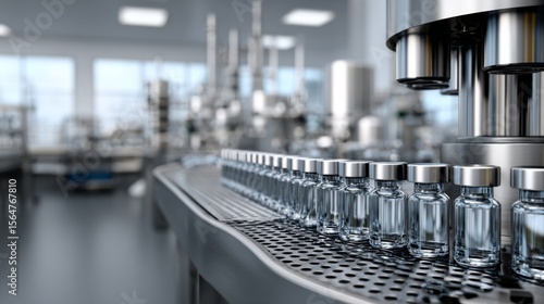 Pharmaceutical vials on a production line in a sterile factory manufacturing