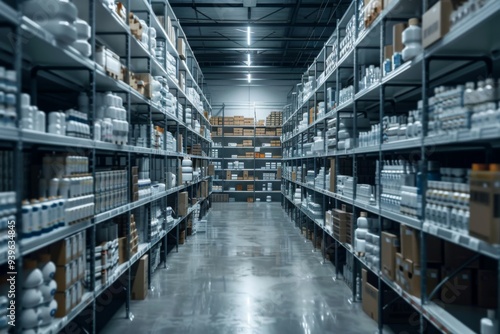 Pharmaceutical warehouse with organized shelves and neatly arranged medication