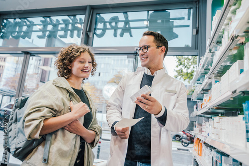 smiling, science, 2, people, adult, woman, man, standing, client, leisure, salesclerk, trade, working, buying, occupation, job, prescription drug, pharmaceutic, young, young adult, adult, mid, male, pair, female, looking, shopping, assistance, support, showing, choice, caucasian, lifestyle, expertise, shelf, shop, retail, medicine, giving, choosing, pharmacy, apothecary