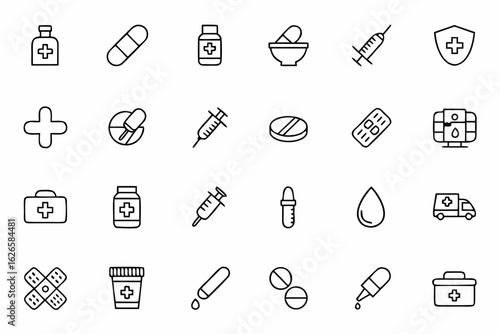 Pharmacy and Medicine Line Icon Bundle – Clean and Minimalist Vectors Representing Pharmaceutical Care, Medication, and Health Services