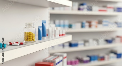 Pharmacy Shelves with Various Medications and Bottles in Medical Store