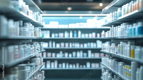 Pharmacy store drugs shelves, pharmacy business store, showcasing various types of prescription medications medical supplies, Shelves with Health Care Products, Concept of pharmacist, blurred image