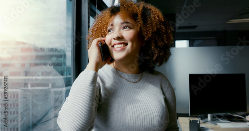 Phone call, business woman and office window for conversation with city view while happy and talking. Entrepreneur person on with smartphone for networking, communication or deal proposal with smile
