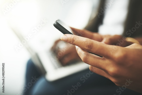 Phone, laptop and hands of people with job search, opportunity or online application at recruitment agency. Technology, networking and employees in hr office for interview, internship or registration