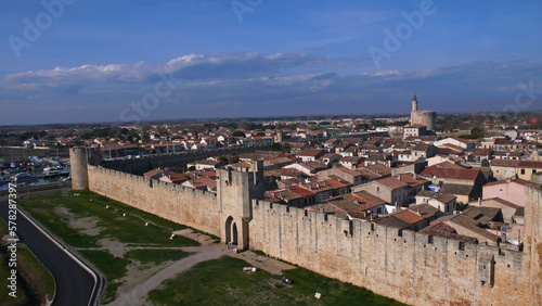 Photo aérienne Aigues Mortes dans le Gard, Petite Camargue, remparts, cité médiévale Languedoc Roussillon , Occitanie France