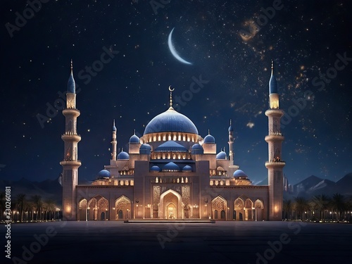 Photo Eid al-Fitr Celebration Best Mosque Glowing under Starry Night Sky with Crescent Moon Background