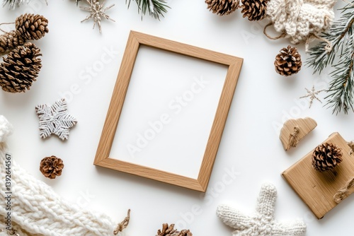 Photo frame mockup with a wooden texture on a white background, surrounded by cozy winter elements like knitted toys