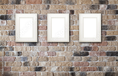 Photo frames on brick wall