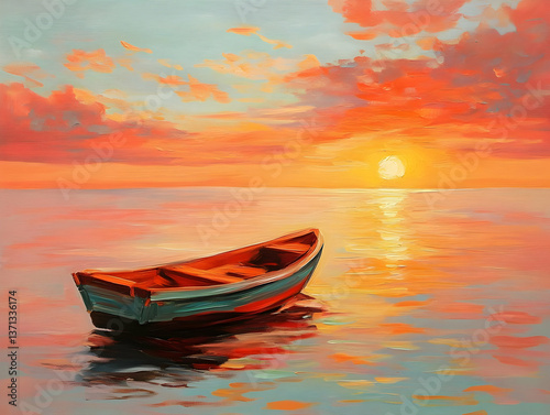 sunset, boat, ocean, water, sky, orange, red, sea, gold, sun, horizon, cloud, landscape, nature, evening, calmness, peaceful, serene, travel, destination, summer, vibrant, scenic, beautiful, colourful, dawn, coast, wave, idylli, calm, light, floating, painted, artwork, art, digital artwork, illustration, vessel, sailing, journey, explore, adventure, sunlight, glow, romantic, warm, skyline