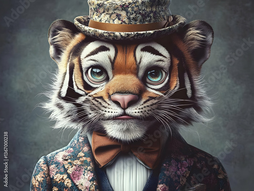 tiger, portrait, animal, elegant, fashion, suit, closeup, artistic, detailed, formal, costume, bow tie, hat, textured, surreal, whimsical, unique, vibrant, colours, eye, expression, soft, sharpened, background, studio, art, digital, illustration, graphic, design, creative, style, modern, contemporary, luxury, stylish, beautiful, fantastic, cute, funny, happy, playful, gentle, intricate, fantasy, character, person, personage