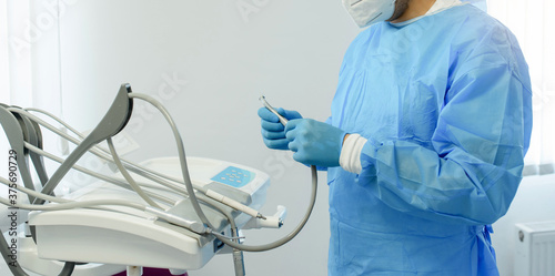 Photo of a dentist surgeon in surgical suit holding a dental drill and prepare for dental implant intervention.