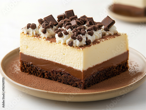 Photo of a Dessert: A Chocolate and Vanilla Cake Slice Decorated with Chocolate Chips
