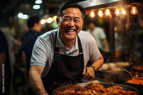 Photo of a happy asian man cooking food in a busy restaurant kitchen