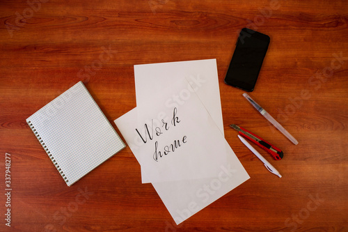 photo of a home workplace with a computer and with text - work at home