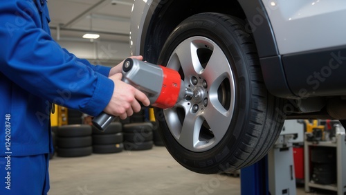Photo of a mechanic using a power tool to remove and install car wheels in a tire workshop, showcasing automotive maintenance and tire change services.