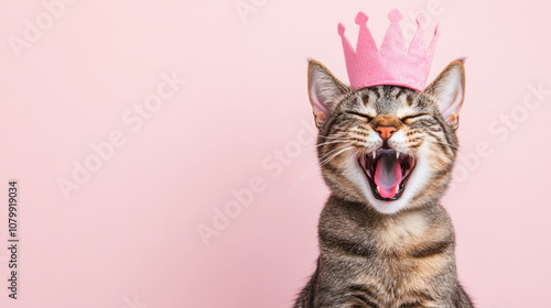 Photo of a smile happy cat kitty wear crown cheerful on pink cute pet background. graphic design adorable wallpaper for advertising celebration birthday party animal vet