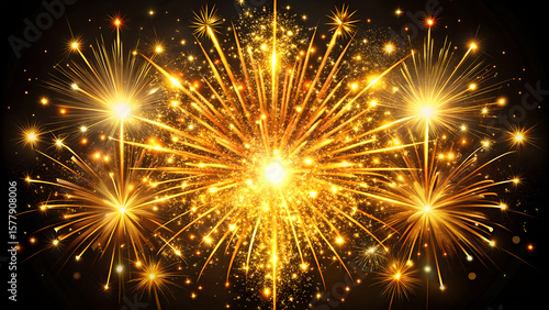 Photo of a spectacular display of golden fireworks exploding in the night sky, creating a dazzling and festive celebration