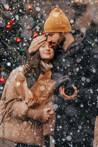 Photo of a stylish young couple in love posing for a photo during a light snowfall at the Christmas street fair.