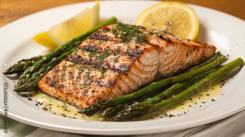 Photo of, A tantalizing plate of grilled salmon served with roasted asparagus and lemon herb butter sauce, Grilled salmon fillet plated elegantly with a sprinkle of chopped dill