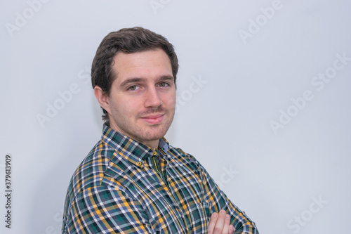 Photo of a young and attractive man wearing a shirt smiling at the camera looking very professional. Casual business man, corporative.