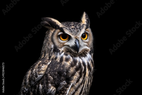 Photo of an eagle owl isolated against a black background, emphasising the eagle owl's majestic features. Wildlife and conservation concept, space for copy.