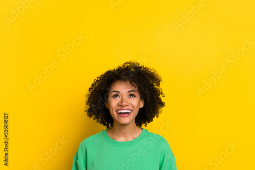 Photo of charming excited woman wear green pullover looking up empty space isolated yellow color background