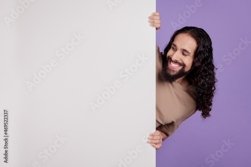 Photo of cheerful man look hold paper placard advertise promotion isolated on purple color background