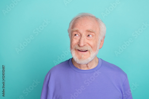 Photo of cheerful minded grandpa look interested empty space imagine isolated on turquoise color background